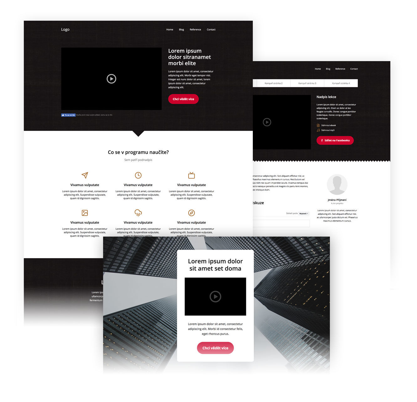 Z předpřipravených šablon můžete poskládat svůj online kurz, veřejně viditelný web, přistávací stránky, celé cesty zákazníka, webinářové, prodejní stránky...